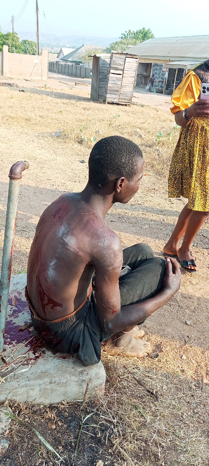 A man with visible injuries on his back and arms sits next to a pipe. Blood is present on his back and around the base of the pipe where he is seated. He is wearing dark-colored pants and is barefoot. A woman with a yellow and black patterned dress and sandals stands nearby, holding a cell phone. The background includes a small wooden structure, a fence, and buildings in the distance. The ground is dry and appears to be covered with dirt and dried grass.