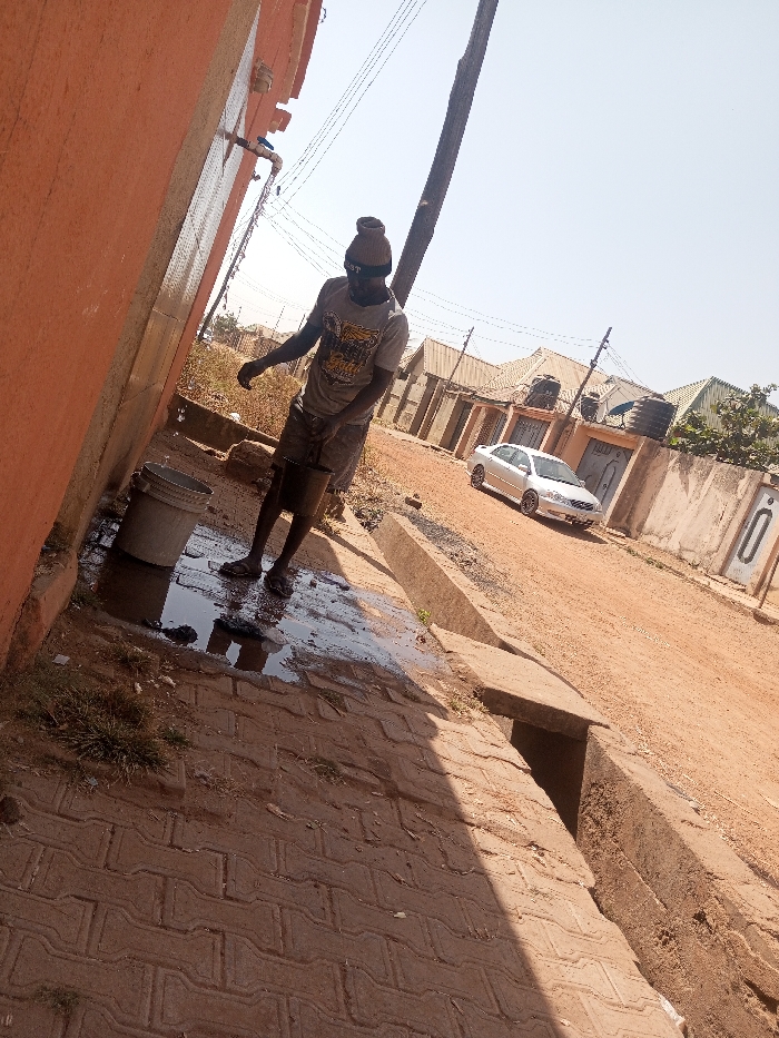 An outdoor scene in Rigasa, Nigeria, captured during daylight hours under a clear sky. A single male individual, with dark skin, stands positioned in the foreground. He is wearing a light-colored graphic t-shirt, dark shorts, a tan knitted beanie, and dark flip-flops, with dark sunglasses obscuring his eyes. He holds a dark-colored bucket in his right hand, extended downwards. His feet are submerged in a substantial puddle of water on a reddish-brown interlocking concrete paver surface. To his left, a larger, light-colored bucket also rests within the puddle. Adjacent to the person and the buckets is an orange-hued wall, from which a white spigot with a blue valve handle protrudes, dripping water that contributes to the puddle. Beyond the paved area, a concrete drainage ditch runs parallel, featuring an open section with a broken cover. A dirt road extends beyond the ditch. A silver sedan, identified as a Toyota Corolla, is parked on the right side of the dirt road, facing away from the camera. Multiple single-story residential buildings line the road in the background, exhibiting various light-colored facades and roofs. Several of these structures feature elevated black water tanks. Utility poles with overhead power lines are visible against the clear sky, interspersed among the buildings. Dry vegetation is visible at various points on the ground and near the background structures. The scene is illuminated by strong direct sunlight, casting shadows.