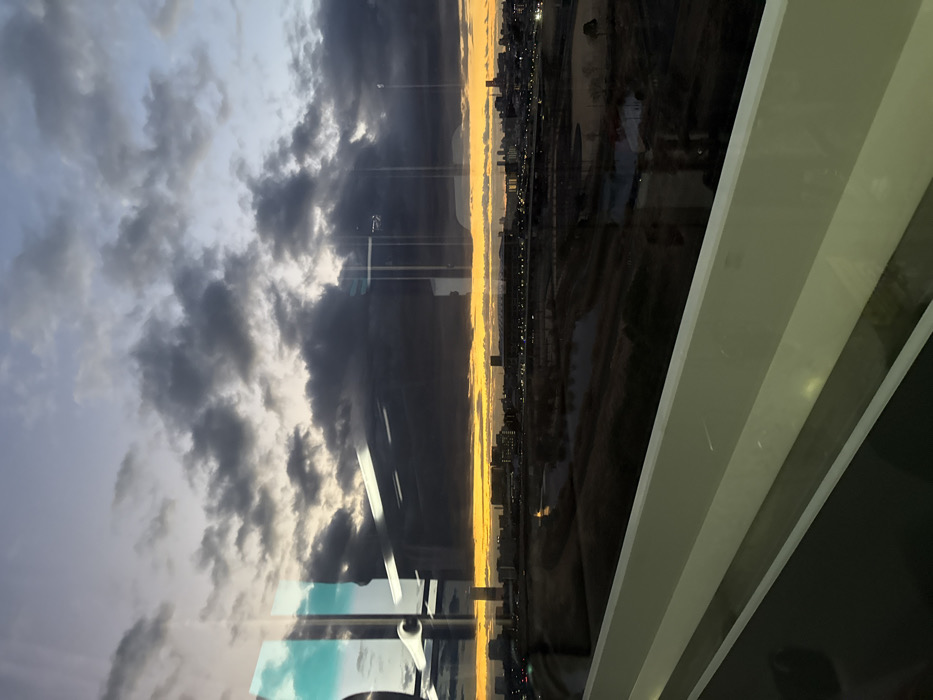 The scene shows a cityscape at dusk, viewed through a window. On the left, dark clouds dominate the sky. The setting sun casts a golden glow along the horizon, illuminating the buildings in the distance. The window frame is visible on the right, adding a sense of depth and perspective. There are reflections on the window creating optical distortions of the scene.