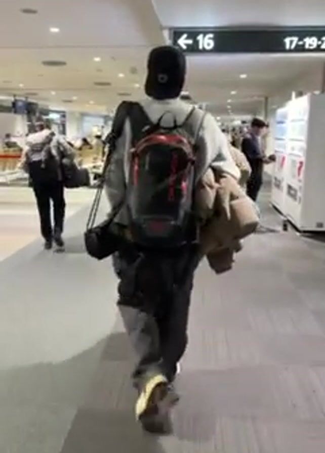 A person with a backpack and a baseball cap is walking through an airport. They are wearing dark pants, a light-colored sweatshirt, and white sneakers. They are carrying a brown coat over one shoulder. There are other people walking in the background, and some are sitting in chairs. There are vending machines on the right side of the screen, and a sign pointing to gate 16 is visible. The floor is gray carpet. The lighting is bright and even.