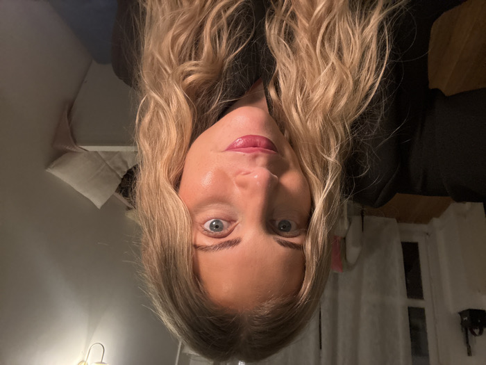 A light-skinned woman with blonde, wavy hair faces the viewer with a slightly tilted head. Her blue eyes are wide and her lips have a glossy pink hue. She wears a black top. The background includes a wall with a pillow, a window with white curtains, and a lamp. The photo's orientation is upside down.