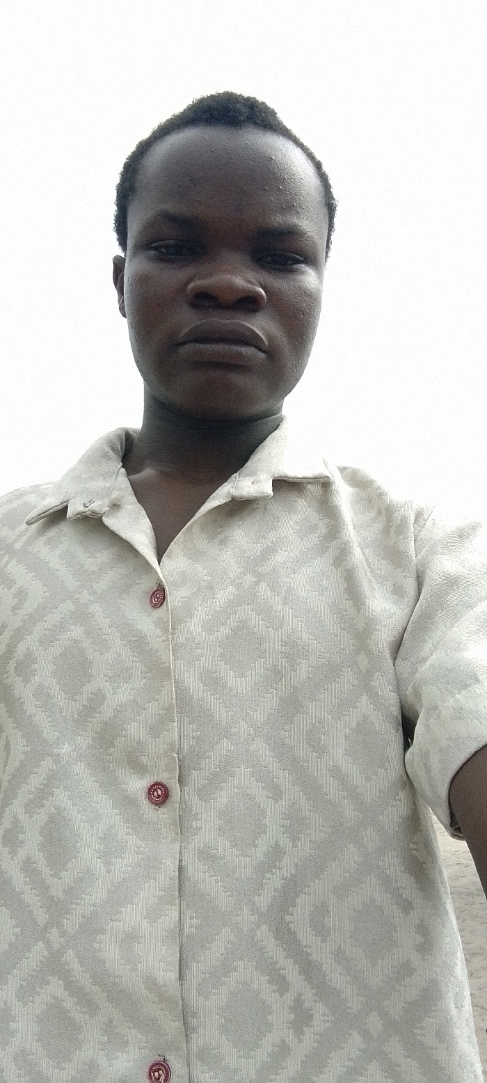 The image presents a close-up portrait of a dark-skinned individual, appearing to be an adult or young adult, facing directly towards the camera. The person has short, dark, curly hair. The facial expression is neutral. Visible dermal irregularities are present on the forehead and cheeks. The individual is wearing a light-colored, possibly beige or off-white, short-sleeved collared shirt. The shirt fabric exhibits a woven geometric pattern resembling repeating diamond or crisscross motifs. Three reddish-brown buttons are visible on the shirt's front placket; the top button is partially visible, and the two lower visible buttons are clearly seen and fastened. The background is uniformly light, severely out of focus, and featureless, providing no specific environmental details to ascertain the exact location within Badagry, Nigeria. No other people, subjects, objects, actions, or interactions are discernible.