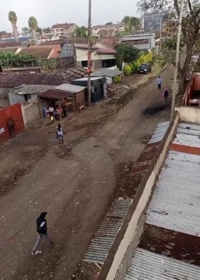 dirt road in a residential area, likely a township. The view is from an elevated position, possibly a rooftop. Several people are walking or standing along the road. A small structure appears to be a shop or stall with people gathered around it. The buildings are a mix of simple structures, some with corrugated iron roofs. There's a parked car further down the road. Power lines run above the street. The weather looks overcast.