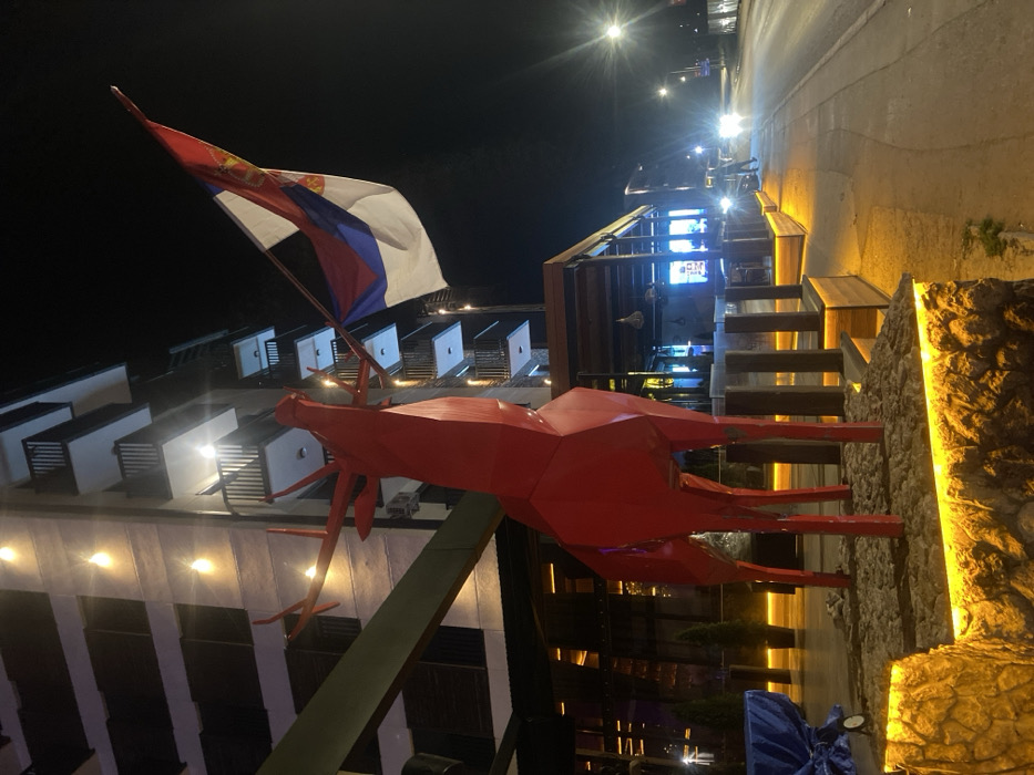 A nighttime outdoor scene features a large, red, geometric crustacean sculpture alongside a Serbian flag