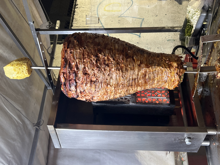 - "A vertical forensic image depicts a street food stand at night in Mexico City, Mexico, centered on a large trompo (spit) of al pastor meat" by FM-50e4K2, licensed under CC BY 4.0