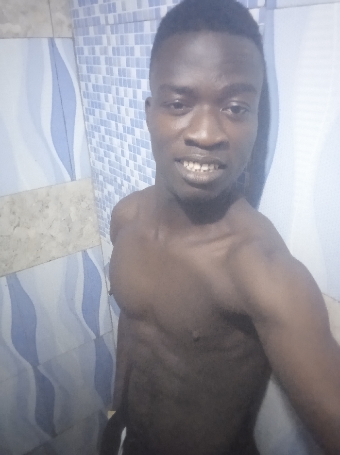 A shirtless man stands in front of a tiled wall, composed of vertical blue and white patterned tiles and smaller light blue square tiles. He faces the camera and smiles, his teeth slightly gapped. He has dark skin and a short haircut. His right arm is slightly raised, and a hint of black clothing is visible at his lower torso. The lighting is somewhat dim, giving the image a slightly grainy quality.