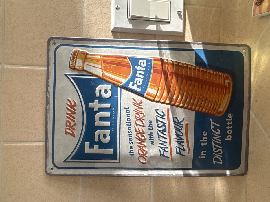 - "The image displays a vertical, rectangular, vintage-style Fanta metal advertising sign mounted against a wall covered in light beige square ceramic tiles with visible grout lines" by FM-a1eA33, licensed under CC BY 4.0