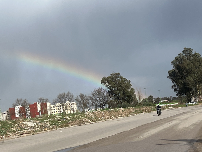 A rainbow arches across a cloudy sky above a landscape. In the foreground is a road with a motorcyclist. Beyond the road are buildings, trees, and greenery. The scene is somewhat overcast, but the rainbow adds a splash of color. The ground appears to be a mix of dirt and vegetation.