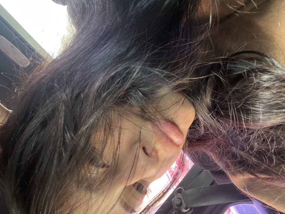An individual with dark hair is pictured from a low angle, inside what appears to be a car. The person's face is partially visible, including their lips, nose, and a glimpse of their eyes, all in soft focus. The hair is voluminous and partially obscures the face. A seatbelt is visible in the lower right corner, reinforcing the setting. Light streams in, illuminating the scene.