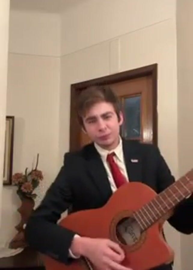 A young man in a dark suit and red tie stands in a hallway, playing an acoustic guitar