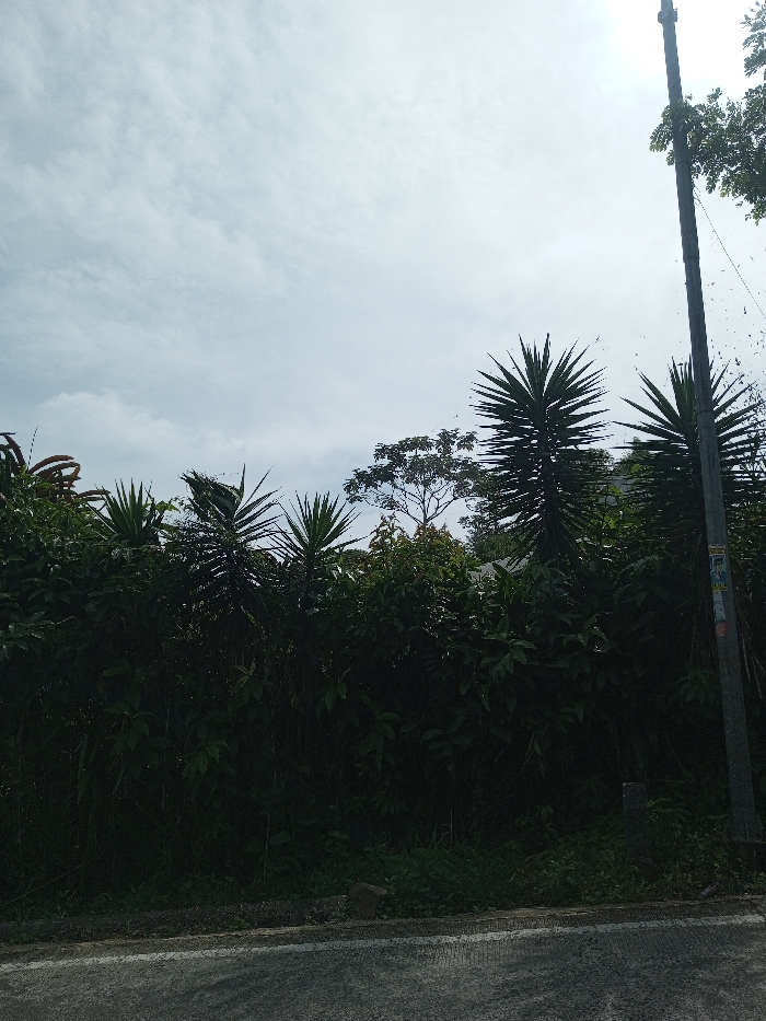 This image depicts an outdoor scene in Kandenuwara, Sri Lanka, during daylight hours under a bright, partly cloudy sky. The foreground shows a segment of a dark gray paved surface, possibly a road or path, with a subtle white line marking an edge. Immediately beyond this pavement is a concrete curb or low barrier, separating it from a dense wall of green vegetation. This vegetation consists of various shrubs and leafy plants, with multiple prominent, tall, spiky-leaved plants (resembling Yucca or Dracaena species) rising above the general foliage. Further in the background, additional trees with varied canopies are visible. On the right side of the frame, a dark gray utility pole stands vertically from bottom to near the top, featuring several weathered, rectangular attachments, consistent with posters or notices. Fine particulate matter or spiderwebs are present around the upper section of the pole against the sky. No human figures or animals are visible.