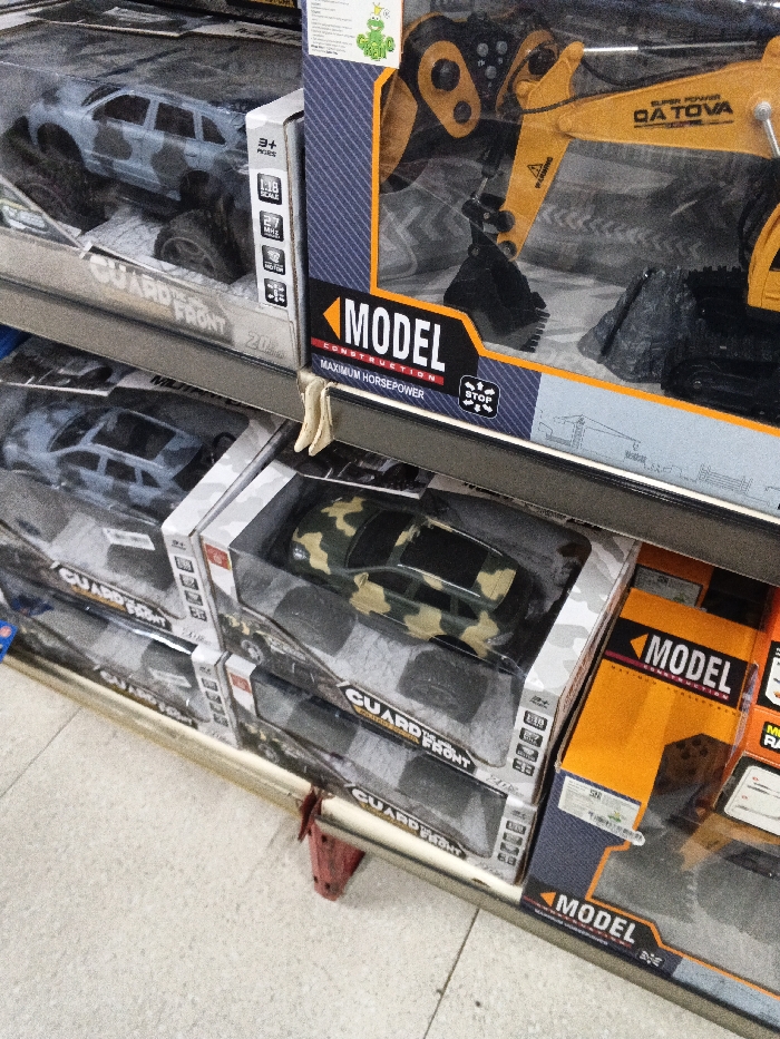 A shelf displays toys in their packaging. On the top shelf, a gray and blue camouflage toy car sits beside a yellow excavator. The excavator's packaging emphasizes "Model Construction" and "Maximum Horsepower." Below, rows of the same toy car in gray camouflage and green camouflage are stacked, labeled "Guard The Front." Next to the green camouflage cars, an orange toy is visible, also labeled "Model."