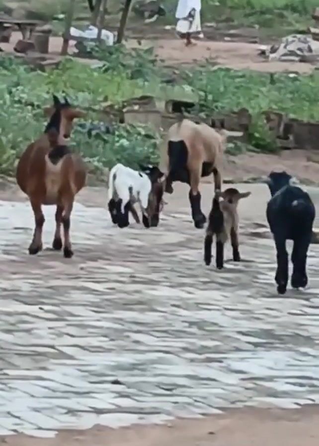 small herd of goats standing on a paved surface. There are five goats in total, with different colors of fur: brown, black, and white. One person is visible in the background, carrying something on their head and walking away from the camera. The environment appears to be rural, with green vegetation and scattered debris in the background.