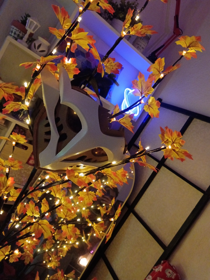An indoor scene, photographed at an upward angle, features a dense cluster of artificial tree branches adorned with orange and yellow maple leaves and numerous illuminated warm-white LED lights, occupying the foreground and central midground. Behind these branches, a decorative, stylized mask or helmet, predominantly white with brown accents and angular features, is partially visible. The reflective surface of the mask shows a faint, distorted reflection of a human figure holding a camera. In the background, to the upper left, a white shelving unit holds various items: a small potted succulent, a white ceramic decorative object, and another potted plant. To the upper right, a blue neon sign in the shape of a ringed planet emits a glow from another shelf, with a red articulated lamp arm visible above it. A section of a light-colored shoji-style room divider with dark framing is present in the mid-right background. The bottom right corner reveals a portion of a red gift box with white patterns. The environment is dimly lit, primarily by the artificial lights within the frame. This scene is situated in Toulouse, France.