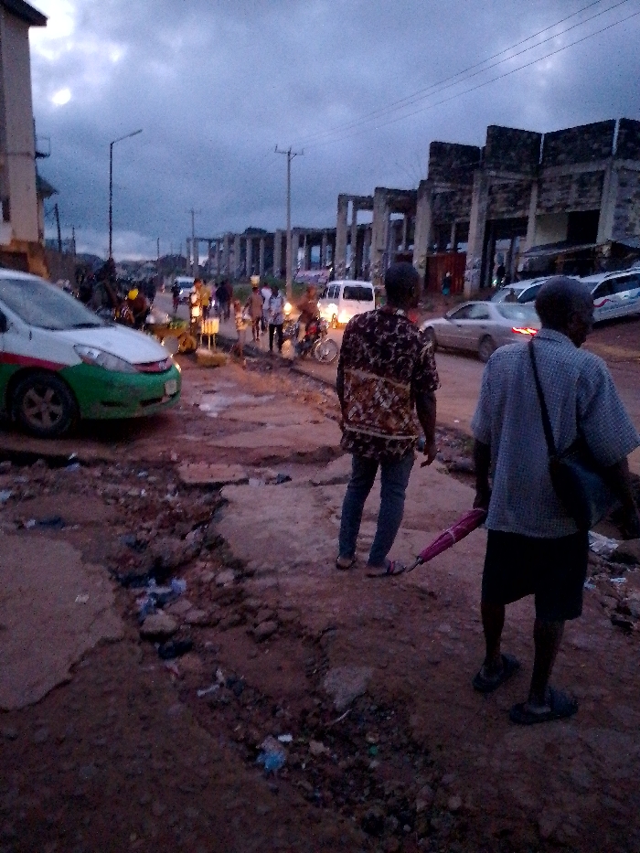 The image depicts an urban street scene in Nnewi, Nigeria, at dusk or early evening under an overcast sky