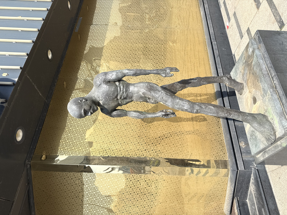A bronze sculpture of a lean, bald male figure in a walking stride is positioned on a dark, rectangular pedestal outdoors