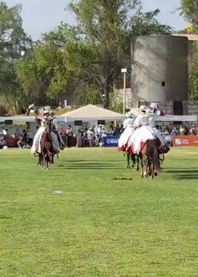group of people riding horses across a grassy field towards the camera. The riders are dressed in white and red outfits, and they are waving to the crowd. The horses are moving at a trot. In the background, there is a crowd of people sitting under tents, as well as a tall, cylindrical building and some trees. The sky is blue.