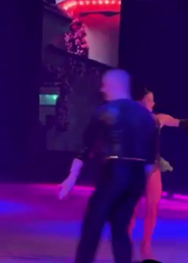 female figure skater performing on an ice rink. The skater is wearing a sparkly, black and green costume with long sleeves on one arm and short sleeves on the other. The skater twirls and glides on the ice. A male skater briefly joins the female skater on the ice. The ice is illuminated with purple and blue lights. A large screen in the background shows a building decorated with red and green lights and flowers. The heads of audience members can be seen in the foreground.