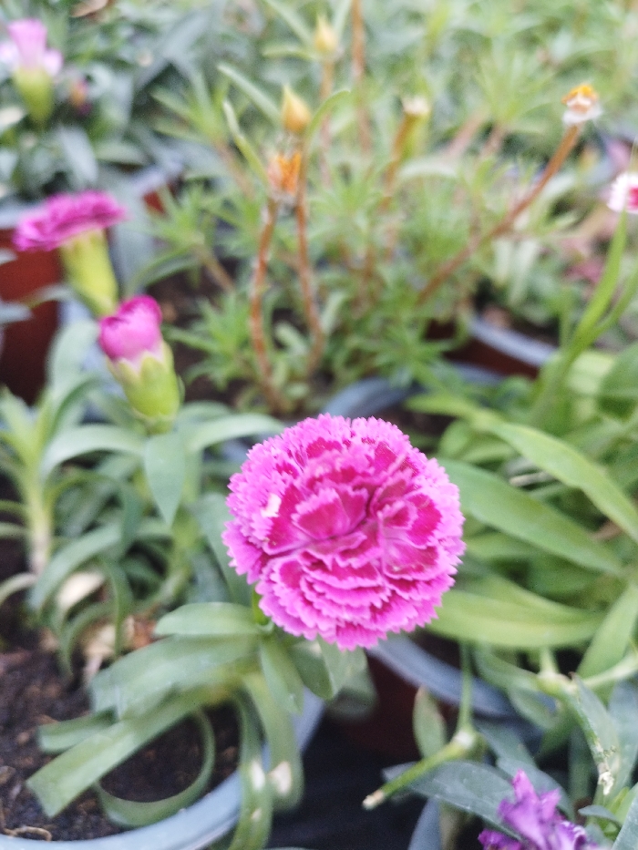 The image displays a detailed close-up of multiple potted plants, located in Dura, Palestinian Territory. The central subject is a vibrant fuchsia-magenta flower, approximately 5-7 cm in diameter, positioned slightly right of the frame's center and in sharp focus. This flower exhibits numerous densely packed, serrated petals, giving it a ruffled appearance. To the immediate left of this flower, a closed fuchsia-magenta bud, encased in a green calyx, is visible and also in focus. Surrounding these are multiple green leaves, appearing narrow and elongated, characteristic of the plant species. The plants are situated within dark, likely plastic, nursery pots, with dark soil visible. The background consists of a blurred arrangement of additional green foliage, slender stems, and several out-of-focus light-colored buds, some with a yellowish-orange tint, and hints of other blurry pink or purple flowers. The lighting suggests natural, diffused illumination, likely in a greenhouse or outdoor nursery setting. No individuals or specific actions are depicted.