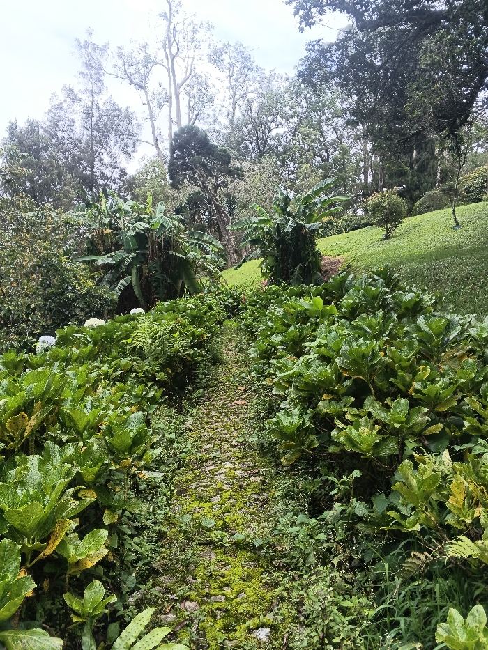 A stone path, covered in moss and greenery, winds uphill through lush foliage