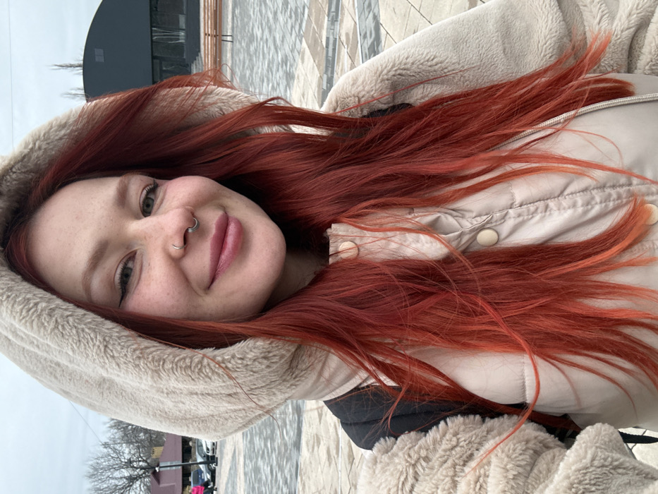 An outdoor, eye-level close-up depicts a female individual in Theater Square, Makiivka, Ukraine. The subject, positioned centrally, has long, reddish-orange hair and is dressed in a light-beige faux-fur-lined hooded jacket over a beige puffer jacket, with a black backpack strap visible on her left shoulder. Her facial features include green eyes with winged eyeliner, freckles, and two silver-colored nose piercings (left nostril and septum). She presents a slight, closed-mouth smile. The background consists of a patterned paved square. To the left, blurred bare trees, a red-roofed building, and parked vehicles are visible. To the right, a prominent building with a dark, curved roof and dark, reflective walls is present, flanked by empty wooden benches. The sky is overcast.