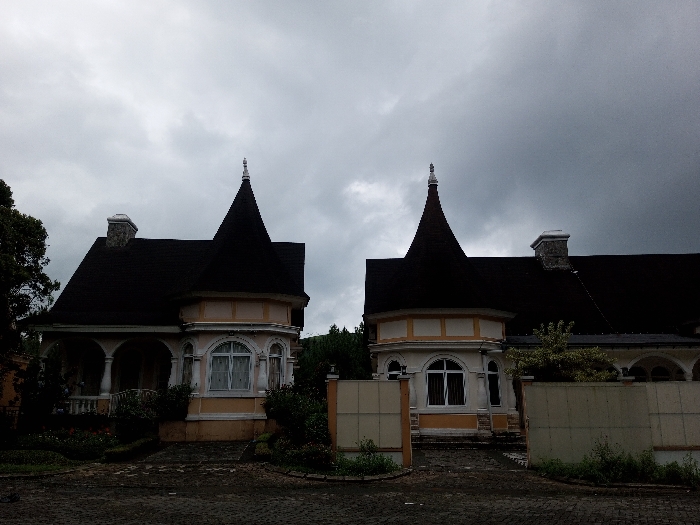 The scene depicts two distinct structures under a heavily overcast, dark grey sky in the city of Orehat, India. The foreground features a dark, textured paved surface, possibly cobblestone, exhibiting signs of wear and scattered weed growth. Both buildings share a similar architectural style, characterized by steep, dark-colored roofs, likely slate or shingles, each crowned with a prominent conical turret topped by a white finial. Stone or textured chimneys are visible on the main roof sections. The exterior walls are light cream or pale yellow with contrasting darker trim detailing. The structure on the left includes a front porch supported by white columns with matching railings and a large arched window. The structure on the right also presents an arched window and is partially fronted by a low, light beige concrete wall or barrier. Dark green foliage and landscaped garden elements are situated around the base of both buildings. No individuals, vehicles, or any active interactions are present within the depicted environment.