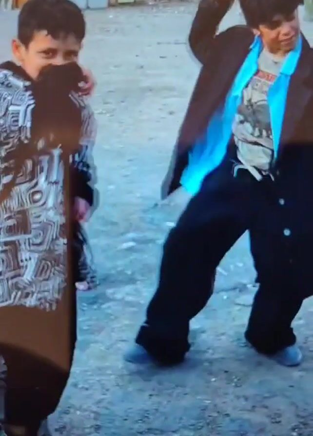 Two boys are dancing outdoors. The boy on the left wears a black and white patterned outer layer and black pants and gray sneakers. He is smiling. The boy on the right wears a brown overcoat, a turquoise blue shirt, a gray t-shirt, baggy black pants, and gray slip-on shoes. The background shows what appears to be a poor neighborhood with rudimentary buildings. They are dancing on a dirt patch. Other people are visible in the background. The camera moves as the boys dance.