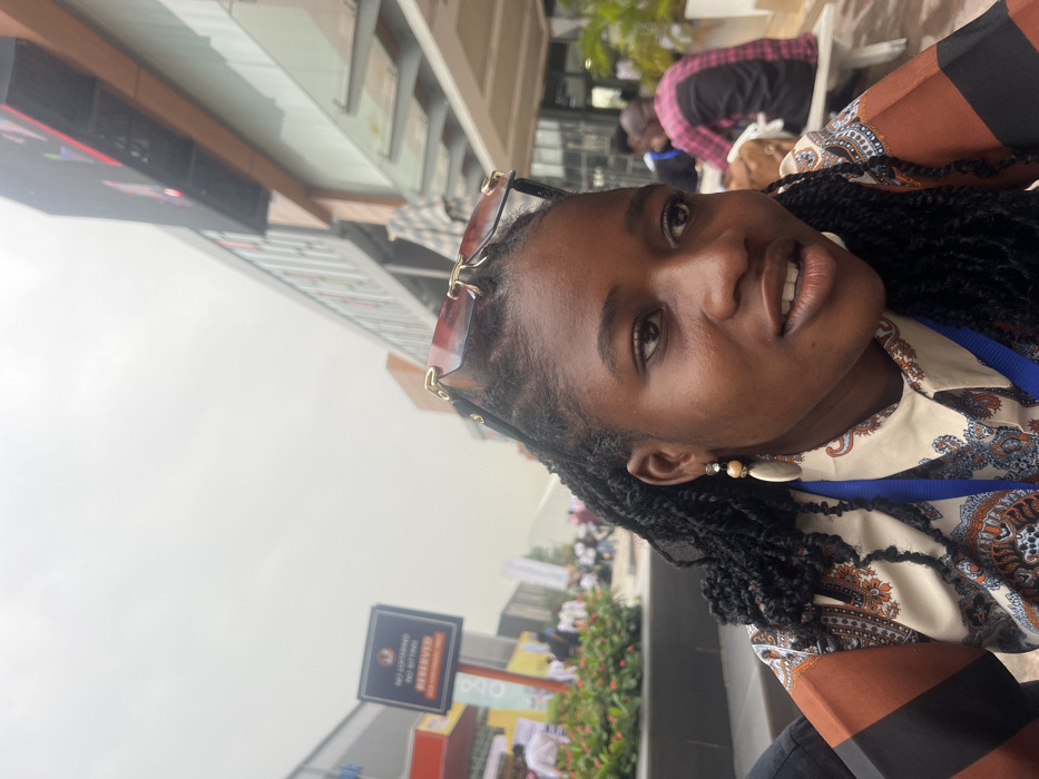 A young Black woman occupies the foreground, positioned slightly right of center, looking towards the right side of the frame with a neutral expression