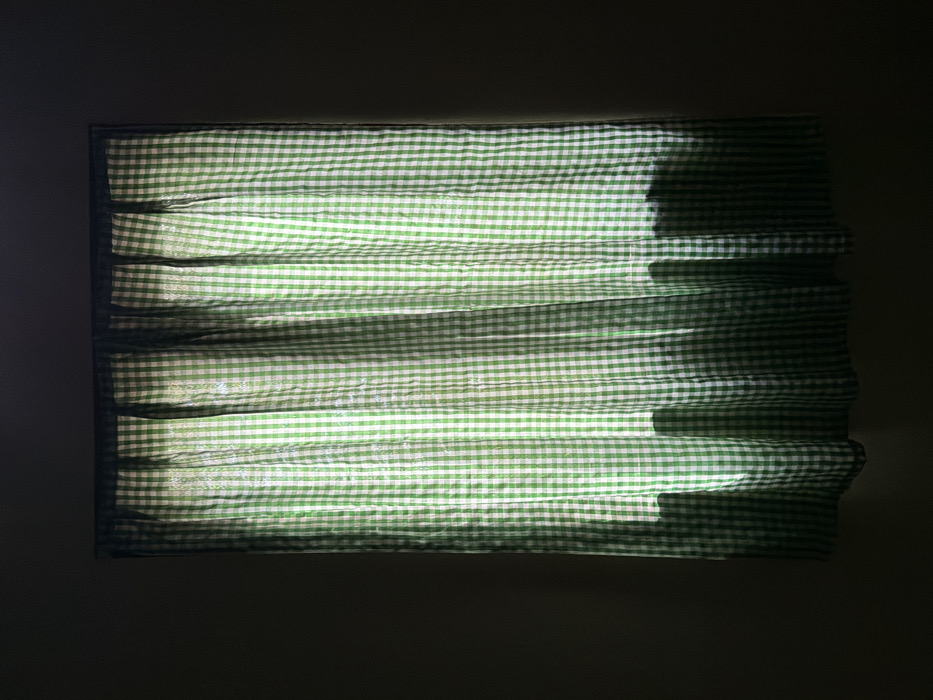 The image depicts a rectangular window covered by a green and white checkered (gingham) curtain, viewed from an interior perspective