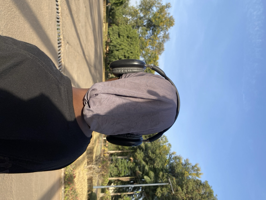 The image captures an individual from behind, standing outdoors in Vom, Nigeria, under a clear blue sky. The person, who appears to have dark skin on the back of their neck, is wearing a grey fabric head covering and large, black over-ear headphones. They are dressed in a dark-colored t-shirt. The ground is a paved surface, likely concrete or asphalt, featuring a metal drainage grate on the left. In the background, numerous trees with dense green and yellow foliage are visible, suggesting a park or heavily vegetated area. A grey light pole stands upright in the right midground. Strong, direct sunlight illuminates the scene, casting a noticeable shadow across the individual's upper back.