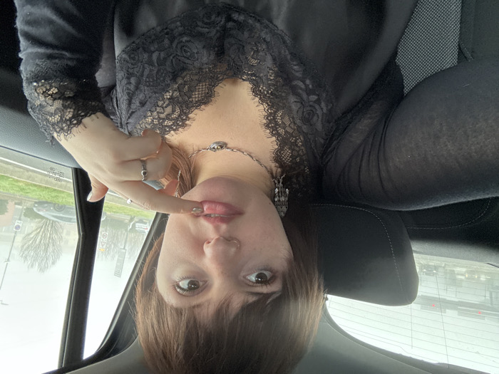 A young adult female with reddish-brown hair and bangs is seated in the rear passenger compartment of a vehicle, facing the camera