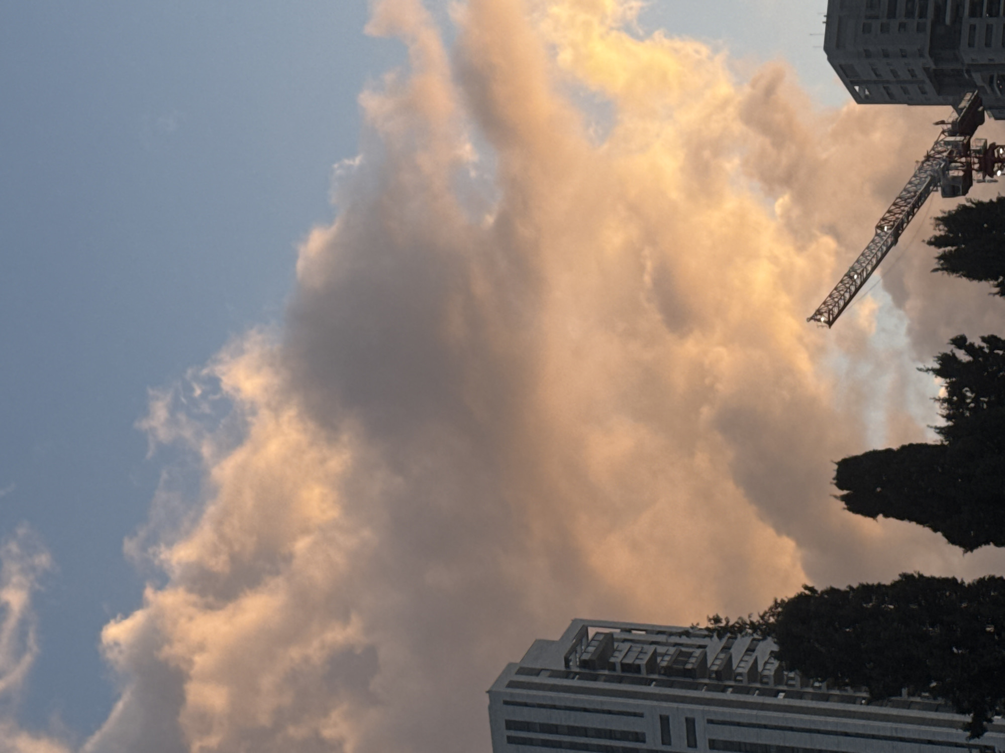 The image is an upward-angled view featuring a cityscape in Bat Yam, Israel, at dusk or dawn. Dominating the scene are large, golden-hued clouds occupying the central area. Buildings are situated at the top right and bottom right of the frame. A construction crane is positioned between the top building and a dark, leafy tree. The sky is blue in the upper left corner.