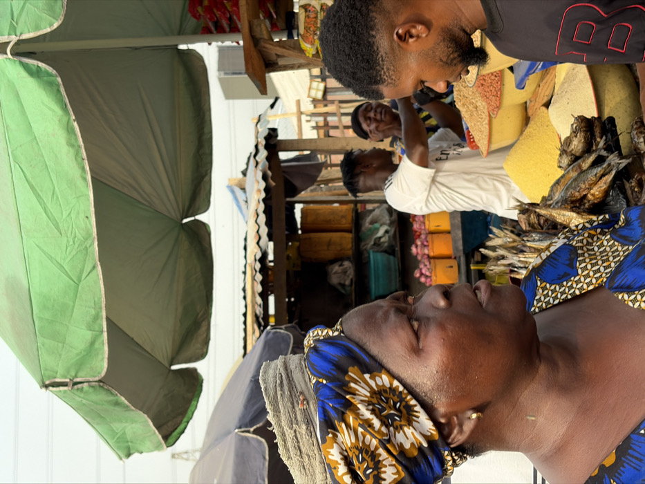 A bustling outdoor market scene reveals a woman wearing a patterned headscarf in the foreground, looking upwards. A variety of goods like dried fish, cheese, and red onions are visible on a stall. Three men are behind the stall, with two of them appearing to be customers examining the wares. A green umbrella provides shade.
