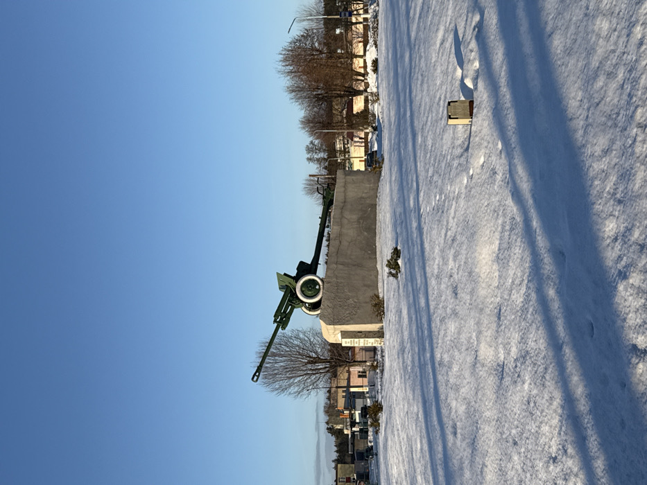 A green cannon stands atop a concrete pedestal in a snowy landscape under a clear blue sky. Bare trees and buildings are visible in the background. The snow covers the ground, casting shadows. A rectangular object stands in the snow. The cannon is angled slightly upward, dominating the scene.