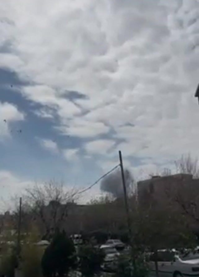 cloudy sky with a building and trees visible in the foreground. A plume of smoke is visible in the distance. The sun is shining brightly in the upper left corner of the frame. There is a street with potted plants along a sidewalk, and a car parked on the side. The camera appears to be held still as the video is recorded.