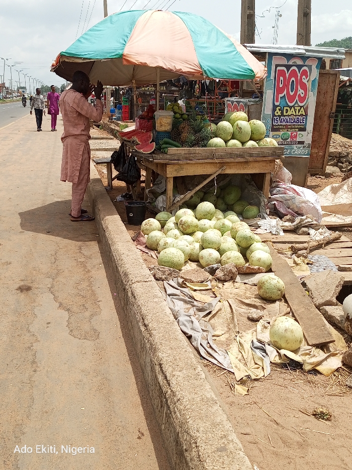 A street vendor is selling watermelons in Ado Ekiti, Nigeria, at coordinates 7