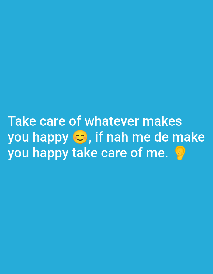 The image displays white text against a solid bright blue background, specifically a cyan shade. The text is centered horizontally and occupies the lower third of the frame. It reads: "Take care of whatever makes you happy 😊, if nah me de make you happy take care of me. 👂". A yellow smiling face emoji with closed, smiling eyes is embedded after the word "happy" in the first sentence. A light brown ear emoji is present at the end of the second sentence. No people or physical objects are depicted. The scene is static, consisting solely of text and emojis on a monochrome background. The location is Unknown, Unknown.