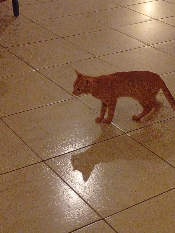 An orange cat stands on a tiled floor, casting a shadow in the lower center of the frame