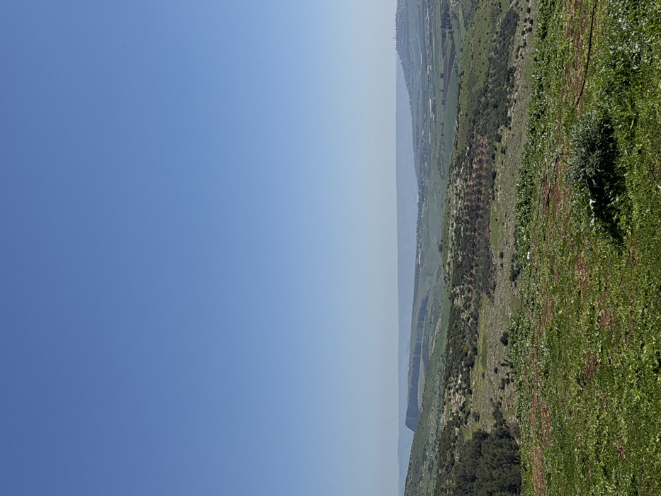 The image depicts an expansive rural landscape within the Galil Tachton Regional Council, Israel, captured from an elevated viewpoint. The upper half of the frame is dominated by a clear, bright blue sky devoid of clouds. The foreground consists of uneven terrain covered with green grass and low-lying vegetation, interspersed with patches of reddish-brown earth. A dark, thin hose or cable lies on the ground in the lower right and center. The midground features rolling hills adorned with a mix of natural greenery and cultivated areas, including what appear to be orchards or groves with regularly spaced trees. A cluster of dense, dark green trees is visible on the left side of the midground. In the background, a distinct, flat-topped geological formation or cliff face is prominent on the left. A hazy, light blue-grey band stretches across the distant horizon, suggesting either a body of water or very distant terrain. To the right of the background, a town or settlement with numerous structures is visible on a hillside, alongside cultivated fields and greenhouses in the valley below. No individuals, animals, or explicit actions are present within the scene. The environment appears serene and is illuminated by natural daylight.