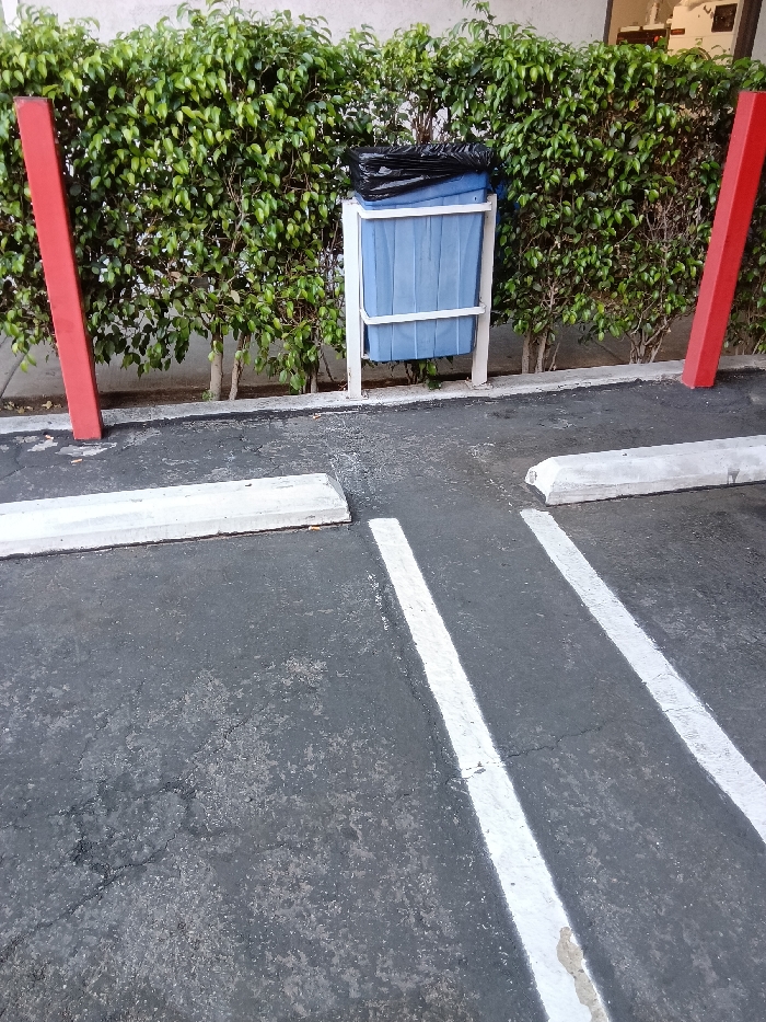 The scene depicts an outdoor parking area in Monterey Park, United States of America. The foreground features dark asphalt pavement with visible cracks and wear. Two parallel white painted lines run horizontally across the lower middle, indicating a parking space. Two gray concrete parking stops are present, one on the left foreground and one on the right. In the midground, a dense green leafy hedge forms a barrier. A light blue, corrugated plastic trash receptacle is centrally located against the hedge, contained within a white metal frame stand. A black plastic trash bag protrudes from the top of the receptacle. To the left of the trash receptacle and partially obscured by the hedge, a vertical red rectangular post is visible. Another identical red post is visible on the far right, also partially obscured by the hedge. Behind the hedge, a light-colored building wall is visible, with a darker rectangular opening in the upper right background. No people or vehicles are present.