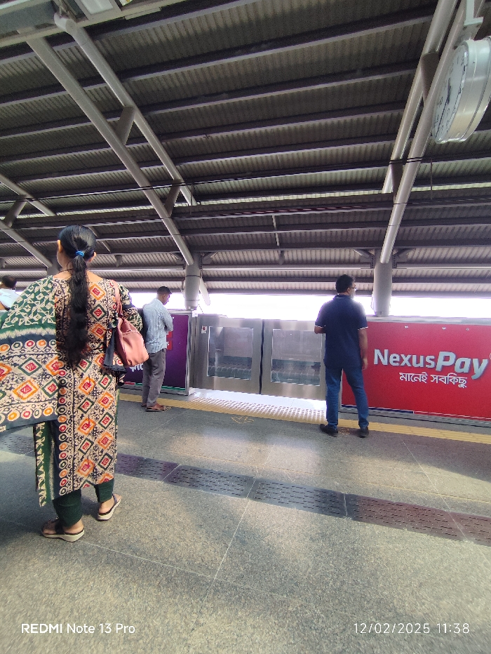 At a train station, a woman with a long braid and wearing a patterned outfit stands on the platform. Nearby, a man in a blue shirt and jeans faces the train doors. To his left, another man stands in a button-down shirt and grey pants. A red sign with "NexusPay" in white text and Bengali script stands next to the train doors. The platform is grey with a tactile paving strip, and overhead is a metal roof structure and a clock. The image is dated 12/02/2025.