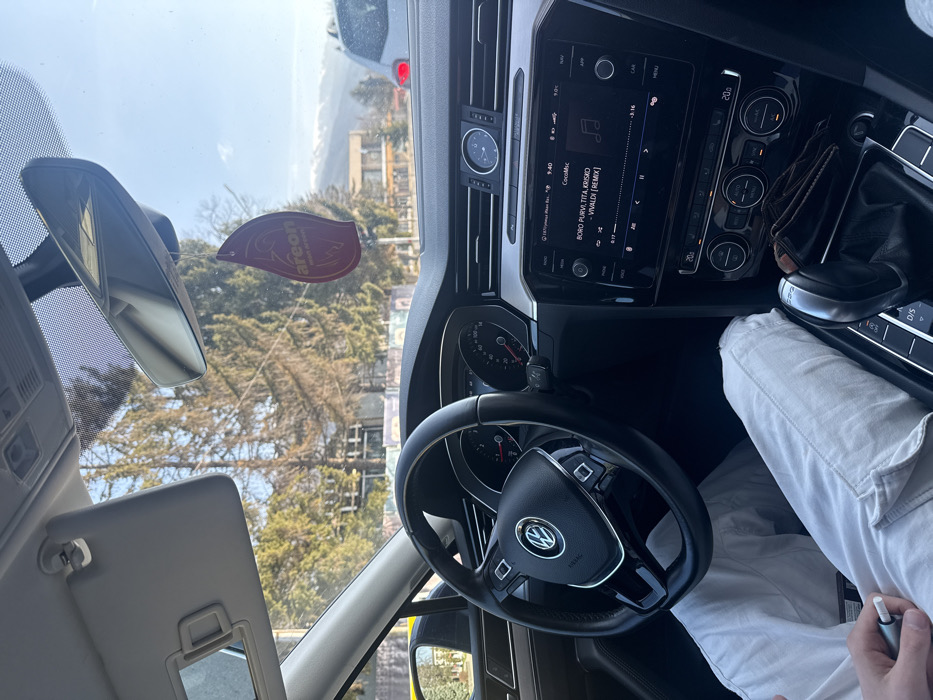 The image depicts the interior of a vehicle, viewed from the front passenger seat, looking out through the windshield onto a street scene in Sopot, Bulgaria. **Vehicle Interior:** The immediate foreground shows the dashboard, steering wheel, and partial lower body of the driver. The black three-spoke steering wheel features a prominent Volkswagen logo at its center. Behind the steering wheel, the instrument cluster is visible, displaying analog gauges for speed and RPM. To the right of the steering wheel, the infotainment system is active, showing a song titled "BORO PURVI, TITA, KRISKO - VIVALDI (REMIX)" with a timestamp of 0:17/3:16. Above the infotainment screen, an analog clock is embedded in the dashboard. Below the screen are controls for climate, set to 20.0 degrees Celsius. An automatic gear shifter with a leather boot is located in the center console. A brown wallet or small pouch rests on the console near the shifter. A red, leaf-shaped Areon air freshener hangs from the rearview mirror. The passenger-side sun visor is in the raised position. **Person:** A person, presumably the driver, is seated in the driver's seat, visible from the waist down. They are wearing light-colored, possibly white or off-white, trousers. The driver's right hand holds a silver and white cylindrical device, consistent with an electronic vaping device, over their lap. **Exterior Environment:** The scene outside the vehicle is bright and sunny. Evergreen trees and deciduous trees with bare branches line the street. In the middle ground, several low-rise buildings are visible. In the distant background, snow-capped mountains rise under a clear blue sky, indicating a mountainous region. Other vehicles are present on the road, including a white car with visible red taillights partially to the right. A yellow element, possibly part of another vehicle or a street sign, is visible on the far left.