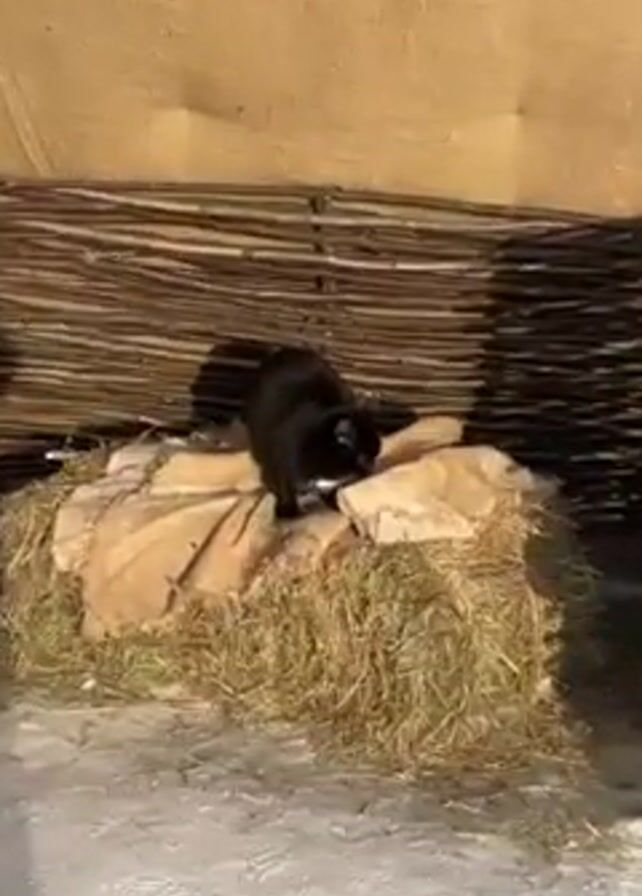 The video depicts an outdoor nativity scene. A black and white cat sits on a bale of hay in front of a low, woven fence. The area is covered in snow. The camera pans to reveal ice sculptures of donkeys, and a small wooden stable containing figurines representing Mary, Joseph, the baby Jesus, and the three wise men. A camel figurine is also present. The scene is decorated with lights and tinsel.
