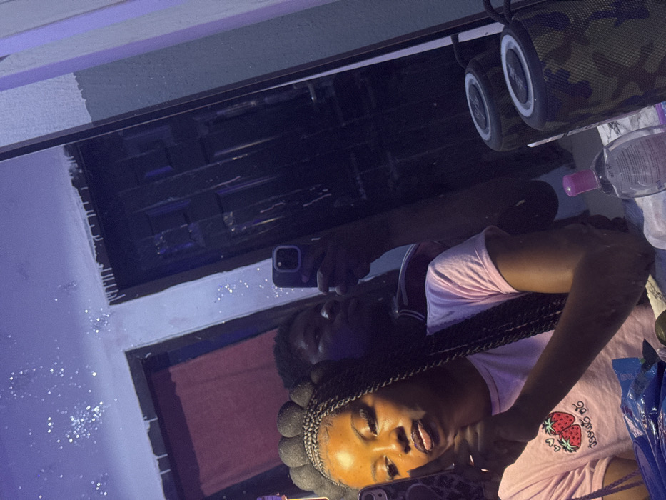 The scene is an interior room, reflected in a mirror, located in Asipa, Nigeria. A dark-skinned female, positioned in the foreground of the reflection, wears a light pink short-sleeved t-shirt with a red strawberry graphic and text. Her hair is styled in numerous dark braids, with a prominent section arranged into large, rounded loops on top of her head. She holds a dark-cased smartphone in her left hand, angled towards the mirror. Behind her, partially visible over her right shoulder, is a dark-skinned male with short dark hair. He wears a dark top with a horizontal red stripe and holds a dark-cased smartphone in his right hand. On the surface immediately beneath the mirror, a clear bottle with a pink cap is positioned next to two cylindrical objects identified as camouflage-patterned portable speakers. Blue packaging material, possibly for food, is also present on this surface. The background reflected in the mirror displays a dark paneled door adjacent to a light-colored wall. Both the wall and the reflected ceiling are adorned with scattered white speckles, consistent with glitter or decorative lighting effects. The room is illuminated by a predominant purple-blue artificial light source, creating a dim ambiance.