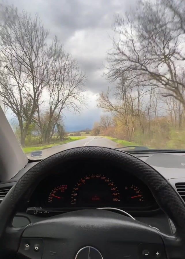 view from inside a car driving down a road. The road is wet, and there are fields on either side. Trees line the road, mostly bare branches visible against the sky. The sky is overcast with a break of sunlight. The car's dashboard and steering wheel, showing a Mercedes logo, fill the lower part of the frame. There's music playing in the background.