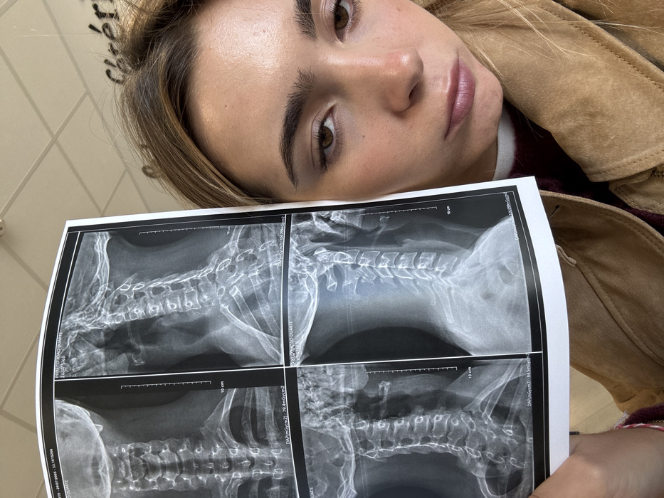 The image displays a close-up, indoor scene featuring a young adult female presenting a medical X-ray film. The subject, positioned on the right half of the frame, has light skin, blonde hair, and brown eyes, looking directly at the camera with a neutral expression. She is wearing a tan or rust-colored jacket over a dark red garment, with a multi-colored wristband visible on her left wrist. Her left hand holds a transparent X-ray film, which occupies the left side of the image. The film exhibits four distinct radiographic views of a human cervical spine, detailing the vertebrae, skull base, and portions of the clavicles. Visible annotations on the film include the date "29/07/2005," a patient name "PEIXOTO JOAO DUARTE," and measurement scales in centimeters. The background consists of a light-colored ceiling and an interior wall. Partial dark cursive lettering, spelling "chéris," is visible on the wall behind the subject's head. The scene is an interior environment, consistent with a medical or clinical facility where X-rays are typically reviewed. The specific location within Saint-Priest, France, is not identifiable from the visual content beyond confirming an indoor setting with French-language context.