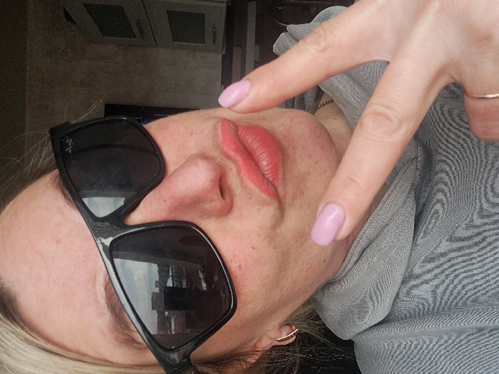 A close-up portrait depicts an adult female indoors in Elektrostal, Russia. Her face, exhibiting freckles, is partially obscured by large black rectangular sunglasses, featuring a visible "Ray-Ban" logo on the right lens. The sunglasses reflect an exterior urban environment, displaying multiple buildings under an overcast sky. The subject's lips are puckered, coated in a coral-toned lipstick. She is attired in a light grey patterned hooded sweatshirt, with a thin gold-colored chain visible around her neck, and a small gold hoop earring present in her left ear. Her right hand is raised, forming a "peace" sign with the index and middle fingers extended. The fingernails on this hand are painted light pink, and a plain gold-colored ring is worn on the ring finger. The background within the interior setting reveals a textured wall and partial sections of light-colored kitchen cabinetry.