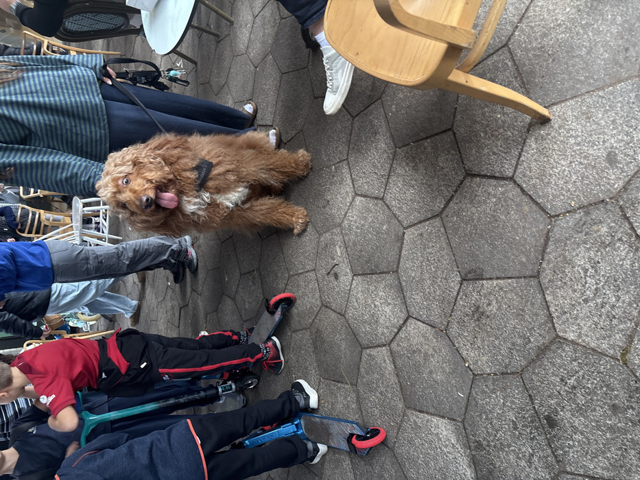 The scene is an outdoor pedestrian area in the city of Ramat Gan, Israel, characterized by hexagonal grey concrete pavers. A reddish-brown, shaggy-haired dog with a white chest patch, identified by a dark collar/harness bearing the name "Oliver," sits on the pavers. The dog is on a black leash held by a person whose lower torso and legs are visible on the right; this individual wears a striped long-sleeve shirt, dark pants, and sandals, and holds a set of keys. The dog faces the camera with its tongue extended and eyes wide. To the left, several people, including children, are present. One child wears a red short-sleeve shirt, black track pants with red stripes, and sneakers, standing near a teal-colored kick scooter. Another child, partially obscured, wears dark pants and white-soled sneakers next to a blue kick scooter with red wheels. Further in the background, out of focus, are additional individuals and elements consistent with an outdoor cafe or public space, including light-colored wooden chairs and a white-topped table with a metallic base, partially visible on the right.