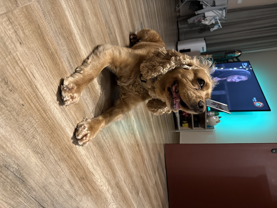- "A tan-colored dog, consistent with a Cocker Spaniel, is depicted lying on a light-brown, wood-effect laminate floor in an indoor residential setting in Sofia, Bulgaria" by FM-uAKBo2, licensed under CC BY 4.0