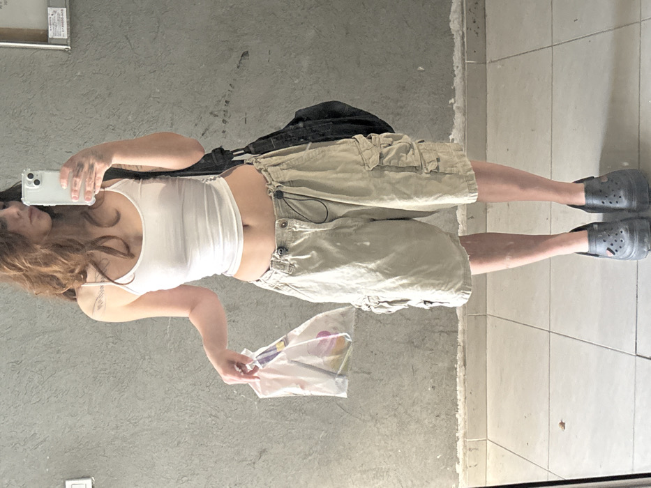 A full-body mirror selfie captures a young female standing indoors, consistent with a hallway or common area within the city of Tel-Aviv, Israel. She possesses long, wavy reddish-brown hair. Her attire consists of a white spaghetti strap crop top, exposing her midriff, paired with baggy, knee-length khaki cargo shorts. Dark grey platform Crocs are worn on her feet. She holds a white smartphone with a clear case in her left hand to take the photograph. A black messenger-style bag is slung over her left shoulder. Her right hand grasps a small, clear plastic bag containing colorful items, including what appears to be a yellow cup with a straw. A tattoo is visible on her right upper arm. The background features a textured, light grey wall, possibly concrete or stucco, with a white baseboard separating it from a light-colored, square-tiled floor. A white rectangular sign displaying black Hebrew text and numerical sequences (e.g., "170059-59") is visible on the wall to the right, confirming the location in Israel. A white rectangular electrical box or panel is partially visible on the wall to the left.